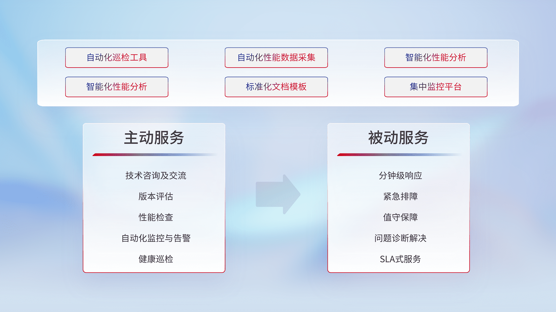 智能化工具和标准化文档,,,保障服务质量,,,提供主动服务(包含技术咨询、、版本评估、、、性能检查、、、自动化监控与告警、、、、健康巡检)和被动服务包含(分钟级响应、、、、紧急排障、、、、值守保障、、、问题诊断解决、、、SLA服务)。。